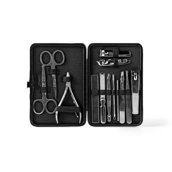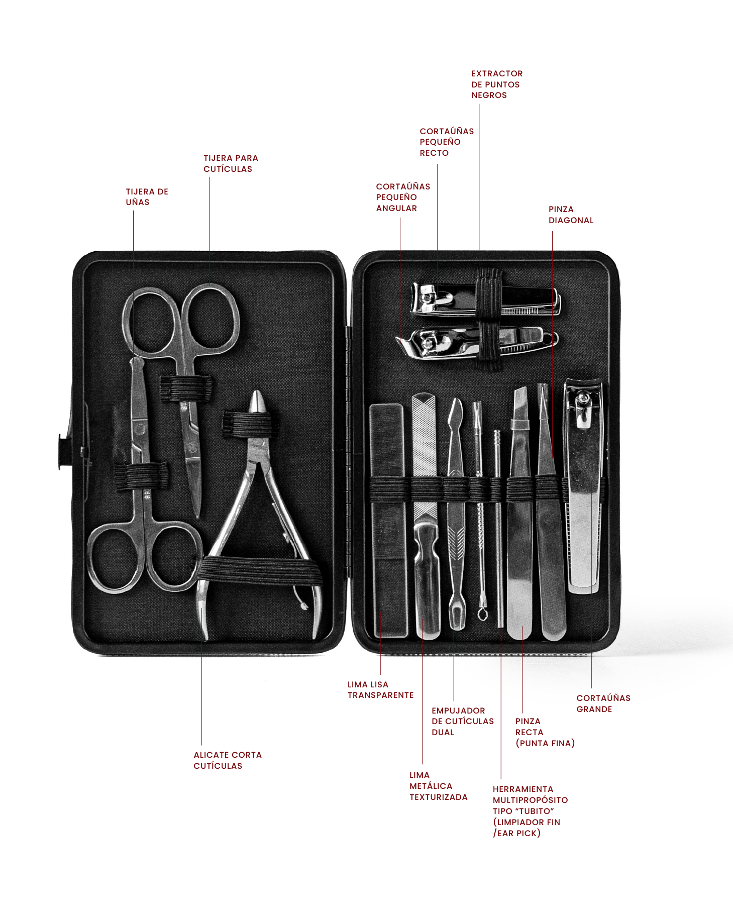 El Manicure Case de Lolas reúne 13 herramientas esenciales para cuidar tus uñas, cutículas y detalles de grooming en un estuche compacto. Incluye herramientas de precisión, limas, cortaúñas y pinzas profesionales, todas elaboradas en acero inoxidable para asegurar durabilidad y un acabado impecable.